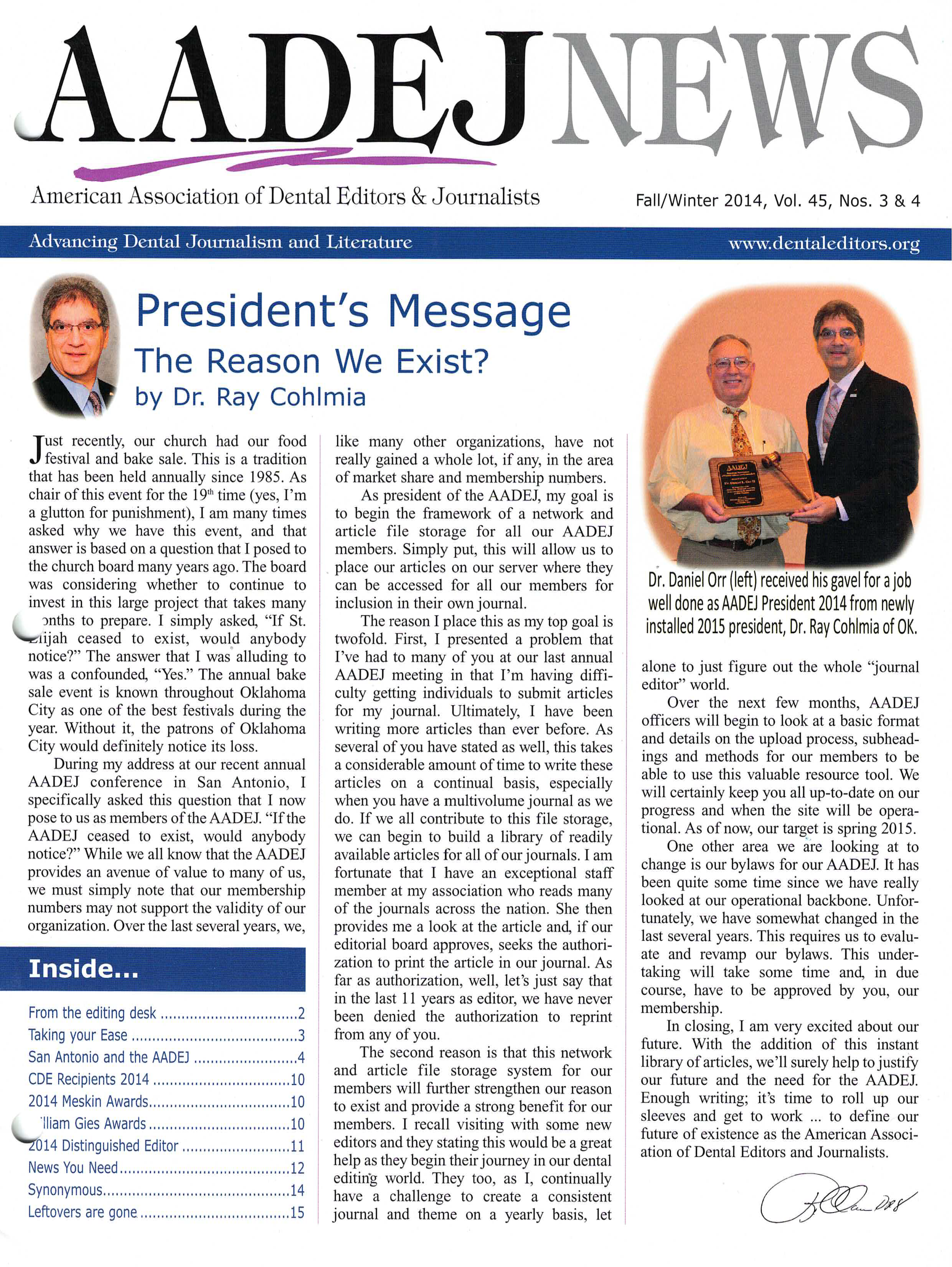 The Communicator is the official journal of the American Association of Dental Editors and Journalists (AADEJ). It is published quarterly, distributed digitally via email to members, and posted on the Association's website, AADEJ.org. Each issue includes regular updates from the editorial team and AADEJ board, as well as feature articles on current issues in the field.