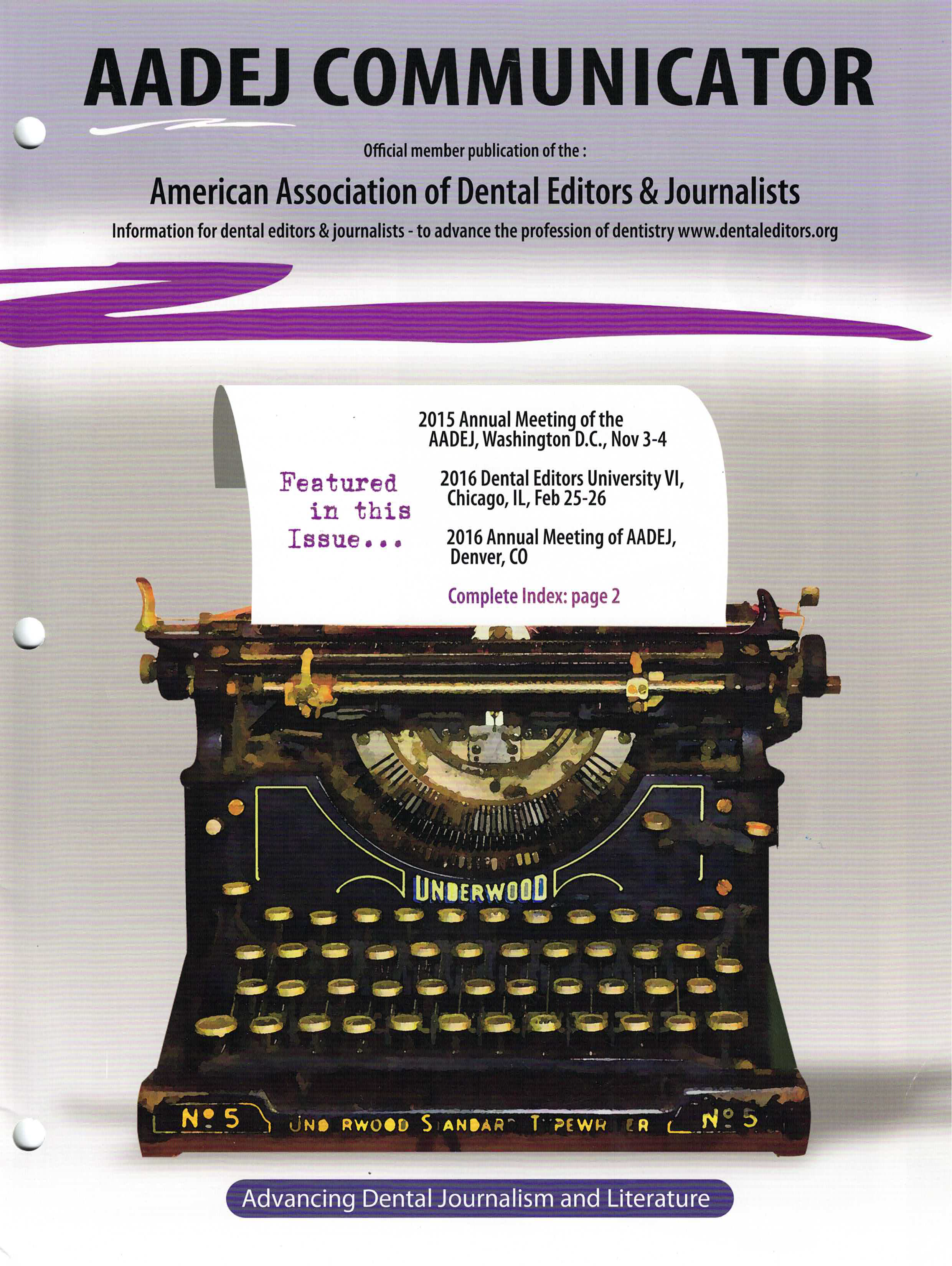 The Communicator is the official journal of the American Association of Dental Editors and Journalists (AADEJ). It is published quarterly, distributed digitally via email to members, and posted on the Association's website, AADEJ.org. Each issue includes regular updates from the editorial team and AADEJ board, as well as feature articles on current issues in the field.
