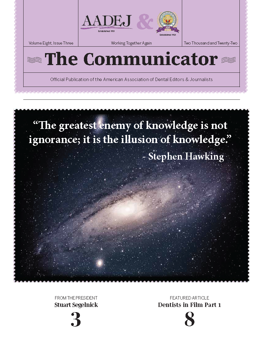 The Communicator is the official journal of the American Association of Dental Editors and Journalists (AADEJ). It is published quarterly, distributed digitally via email to members, and posted on the Association's website, AADEJ.org. Each issue includes regular updates from the editorial team and AADEJ board, as well as feature articles on current issues in the field.