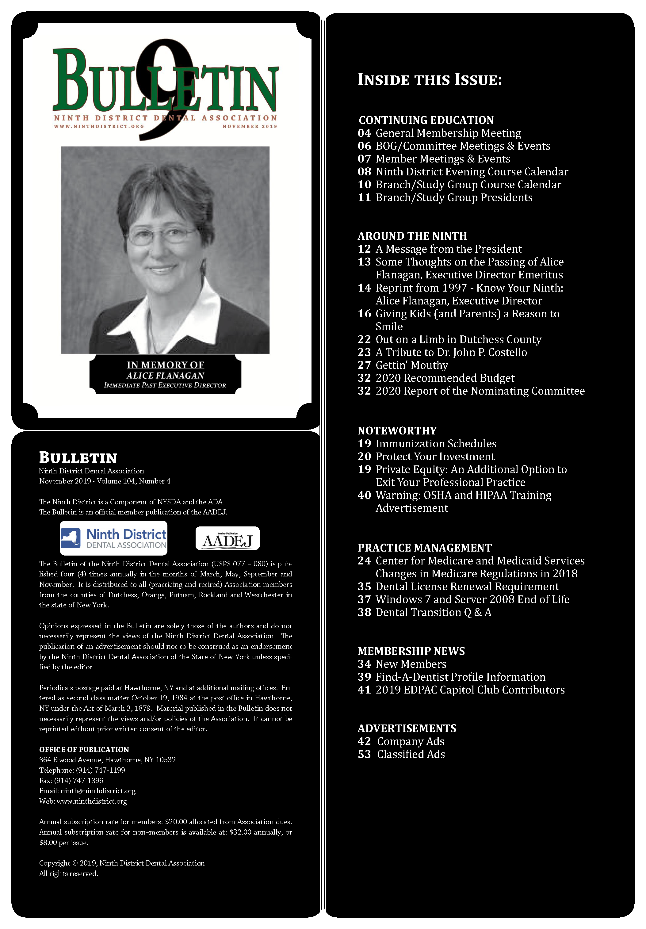 The Bulletin of the Ninth District Dental Association is published four times annually in the months of March, May, September and November. It is distributed to all Association members from the counties of Dutchess, Orange, Putnam, Rockland and Westchester in the state of New York.