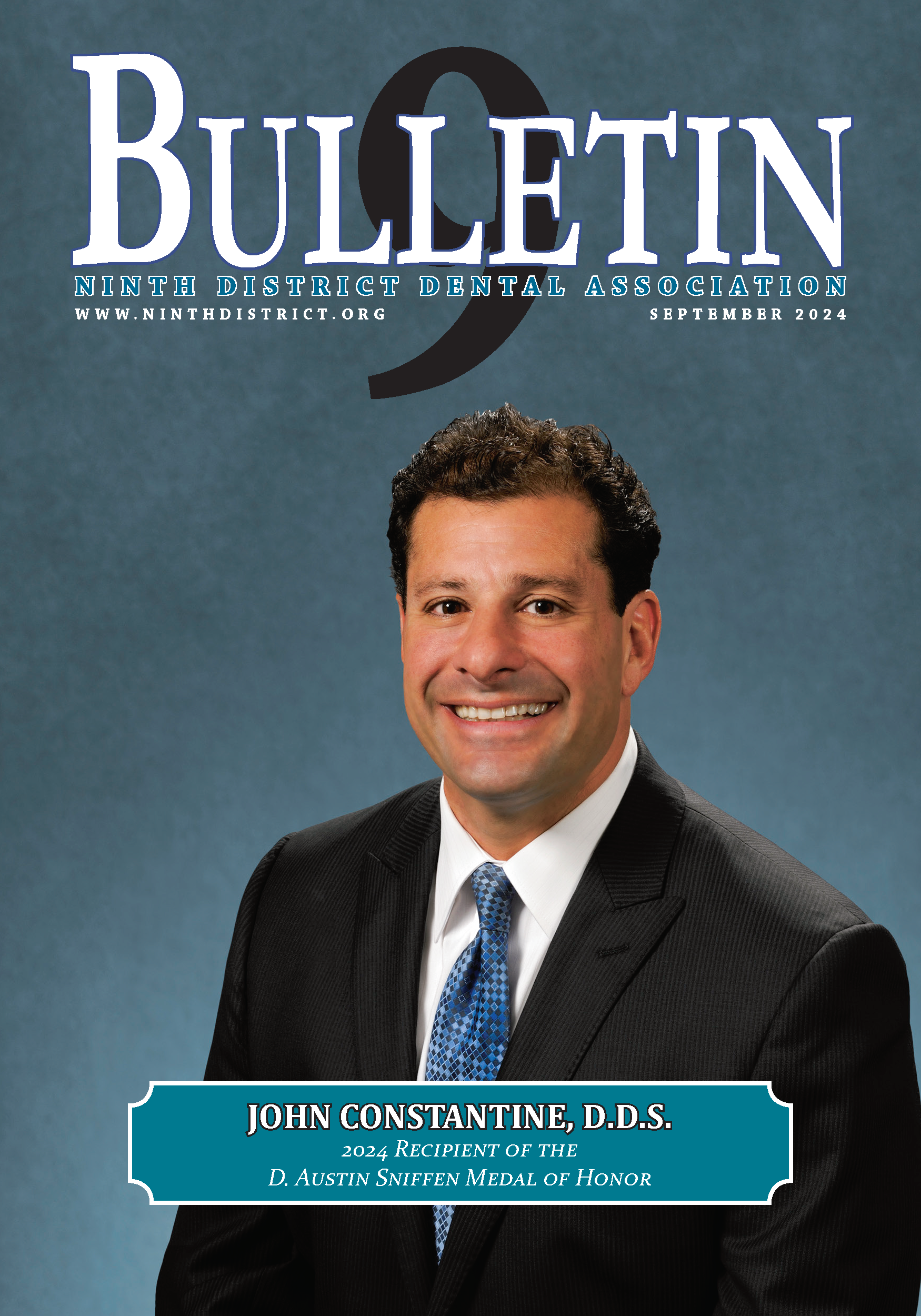 The Bulletin of the Ninth District Dental Association is published four times annually in the months of March, May, September and November. It is distributed to all Association members from the counties of Dutchess, Orange, Putnam, Rockland and Westchester in the state of New York.