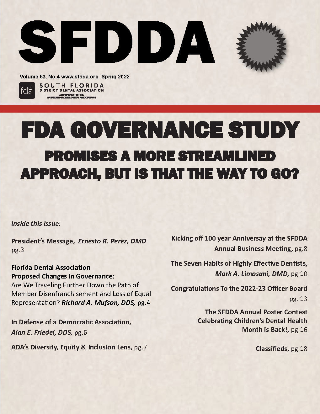 SFDDA Newsletter includes regular columns with regional news impacting the South Florida District membership including: columns from the President and editor, feature articles relating to the field of dentistry, association events and upcoming activities, component news, continuing education opportunities, and classifieds.Full Issue