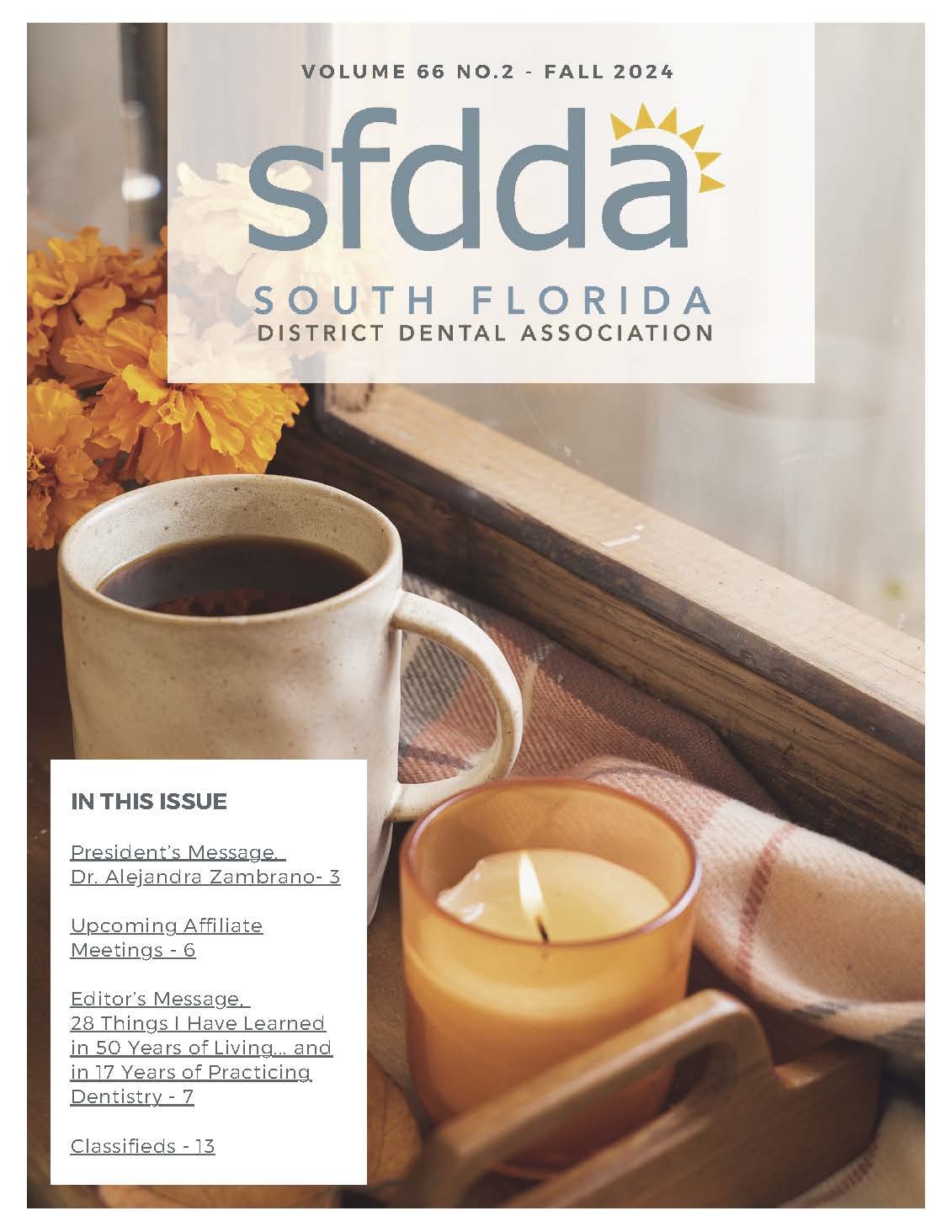 SFDDA Newsletter includes regular columns with regional news impacting the South Florida District membership including: columns from the President and editor, feature articles relating to the field of dentistry, association events and upcoming activities, component news, continuing education opportunities, and classifieds.Full Issue